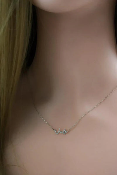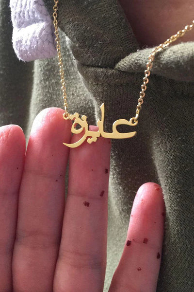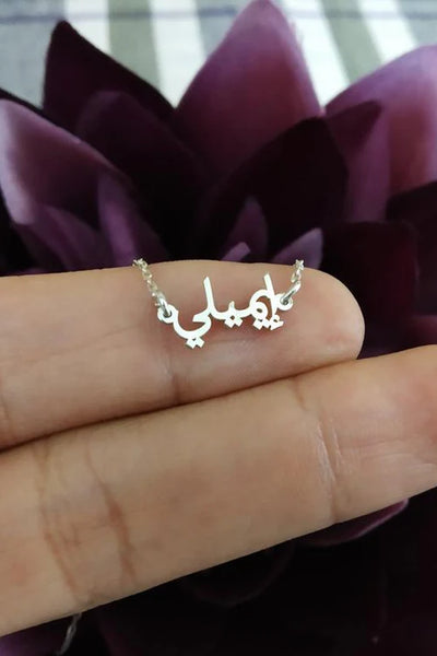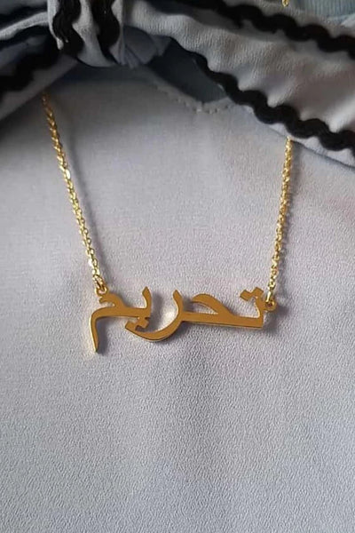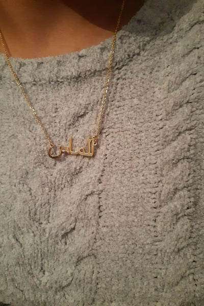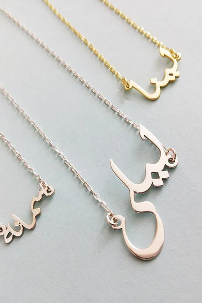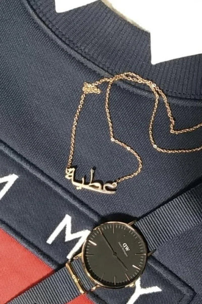 Crafted with a delicate Arabic script design, this necklace offers a minimalist, premium look in a polished finish. Its lightweight build ensures comfortable daily wear, while quality materials provide lasting durability. A subtle personalized piece made to complement any style with refined elegance.